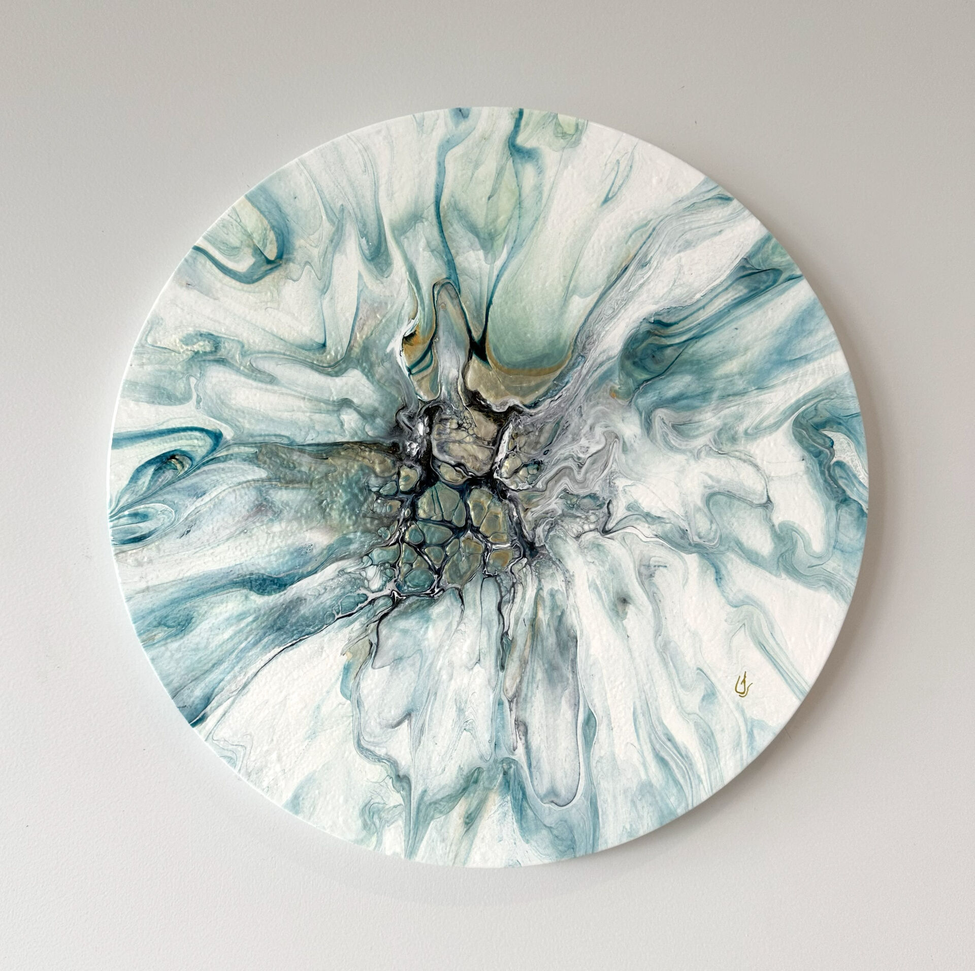 Ice Crater, part of Ice Caves Series, fluid art on wood by Artist Jackie Teer