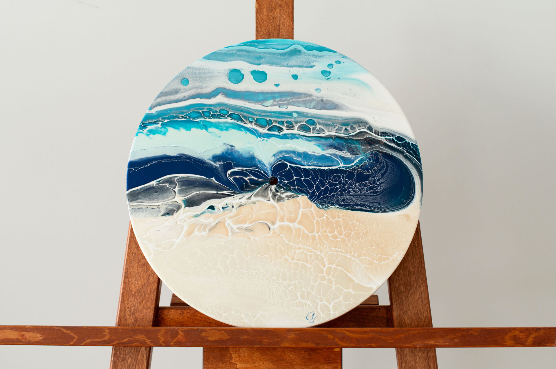 Jervis Bay Beach Series Clock #1 Fluid art on wood by artist Jackie Teer
