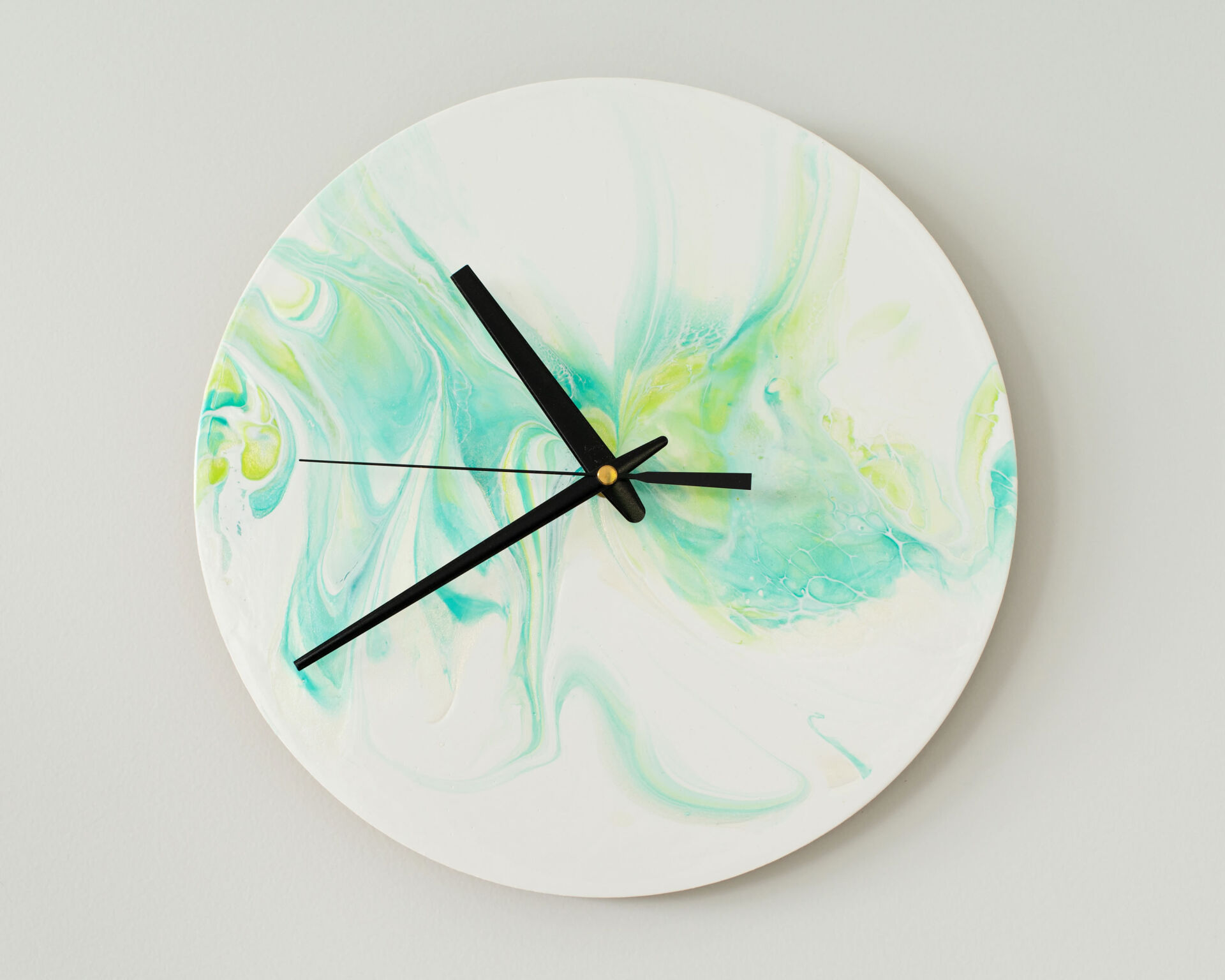 Serenity Clock Fluid art on aluminium surface with wood base by artist Jackie Teer