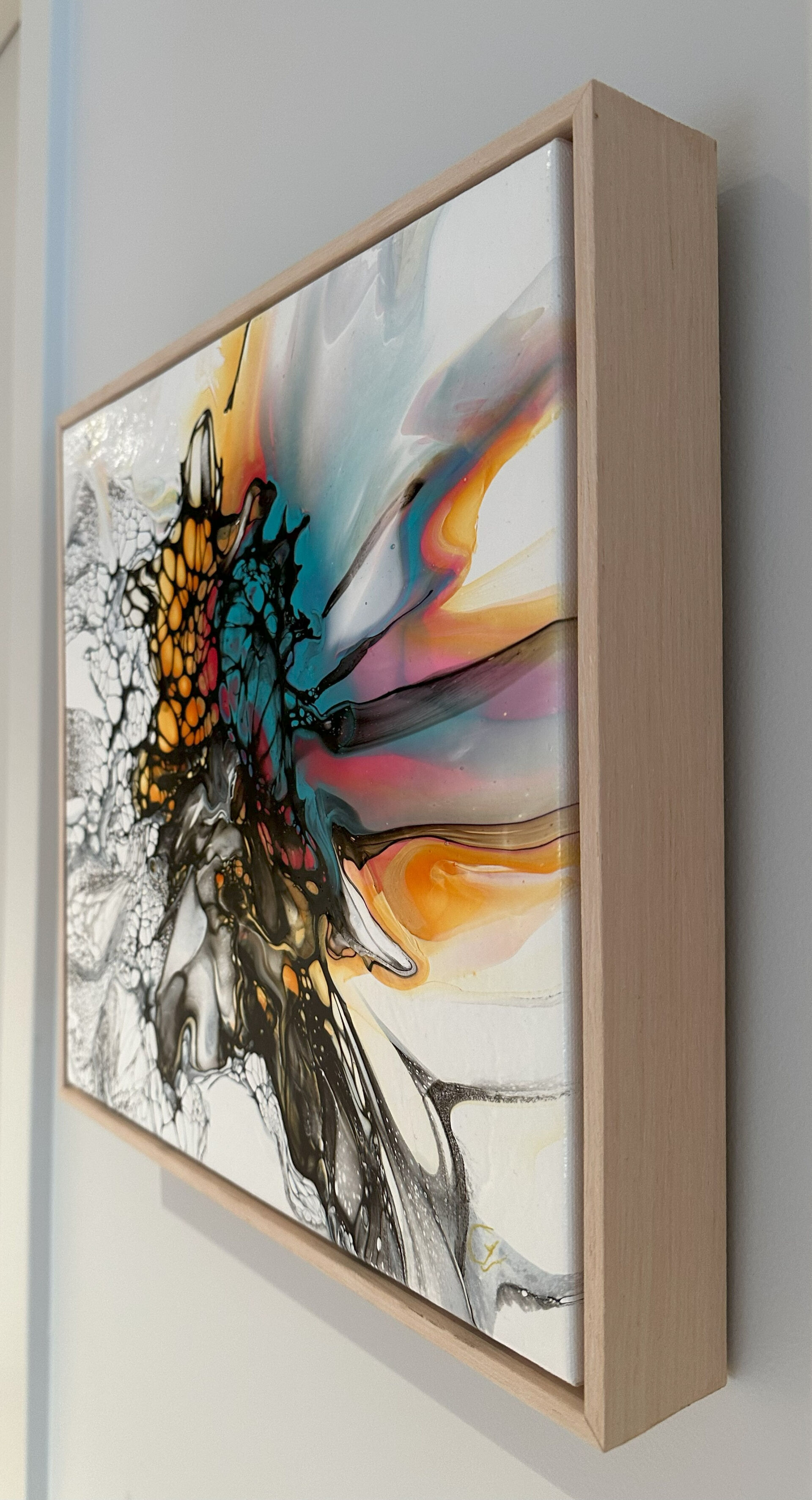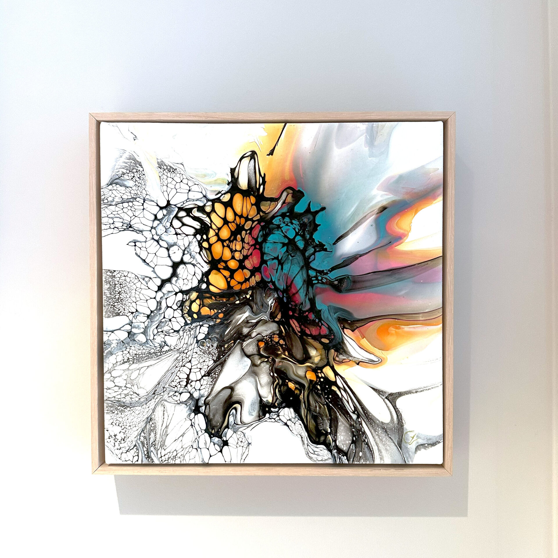 The Scarab Collection #5, fluid art on canvas by Artist Jackie Teer. Framed in natural wood floating frame.